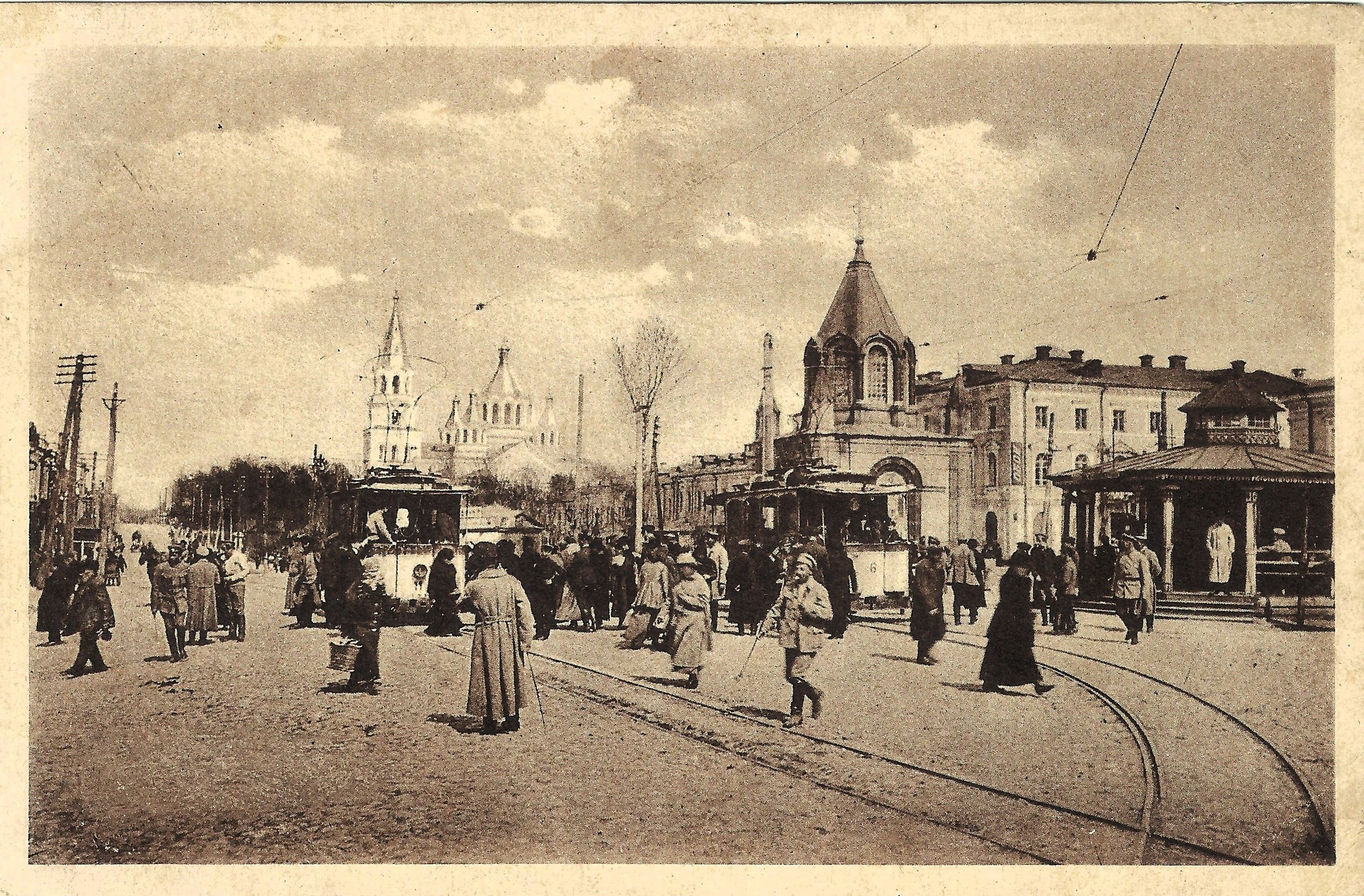 На фото — Житомир кінця Першої світової: трамваї, бруковані вулиці, щоденний рух міста, люди в довгих пальтах і військовій формі. Важливо, що ці кадри не пізніші за 1918 рік, хоча інколи їх помилково відносять до 1920-х або навіть 1930-х.