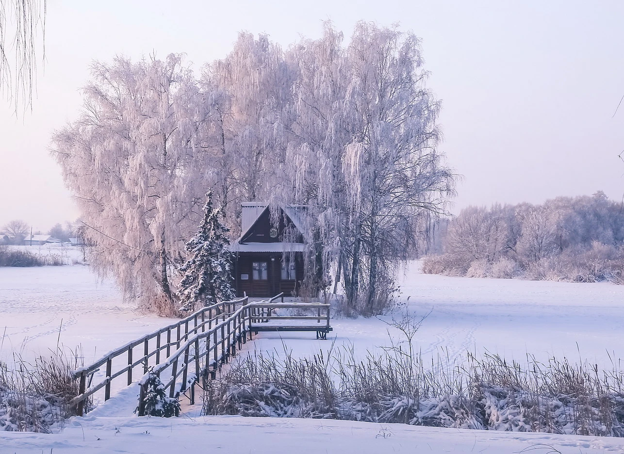 Кадри передають тиху, майже нерухому зиму: берег водойми, вкритий снігом, дерев’яний місток, старі верби й хатина, що ніби зливається з природою. Світло ранку та заходу сонця додає пейзажам тепла навіть у морозний день.