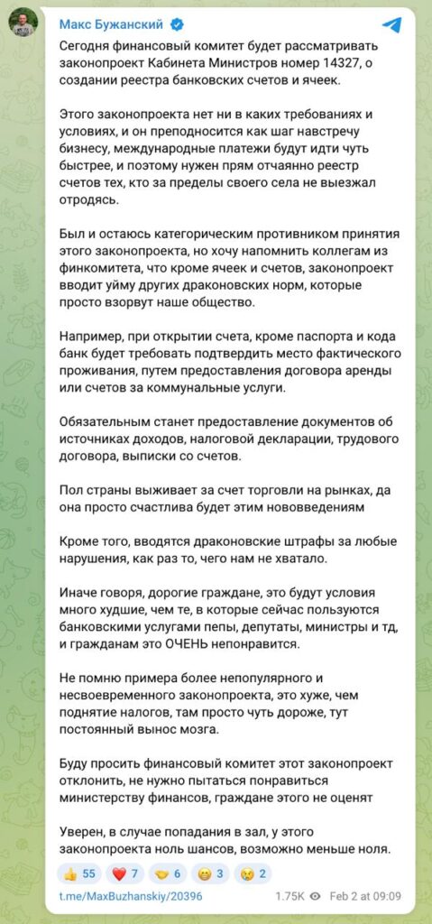 Бужанський наголошує, що ухвалення такого документа не є вимогою міжнародних партнерів України чи фінансових інституцій на кшталт МВФ. Водночас, за його словами, ініціативу подають як крок назустріч бізнесу — мовляв, міжнародні платежі проходитимуть швидше завдяки створенню централізованого реєстру рахунків.