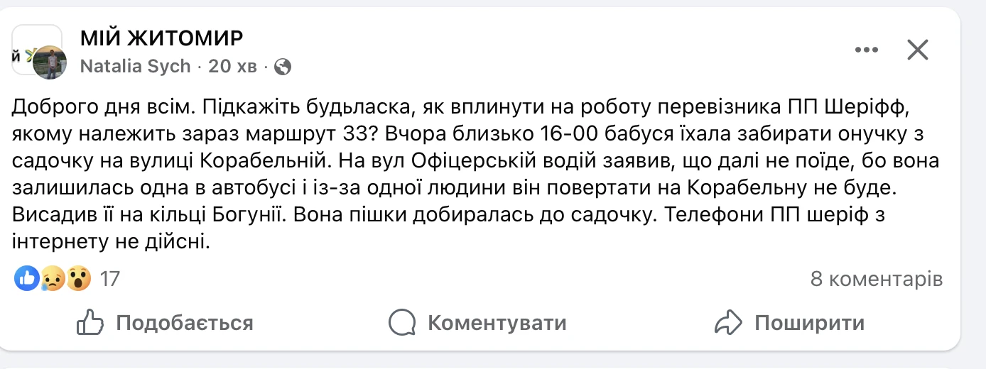 Жінку висадили на кільці Богунії. Далі їй довелося йти пішки до садочка. Як зазначає авторка допису, контактні телефони перевізника, знайдені в інтернеті, виявилися недійсними.