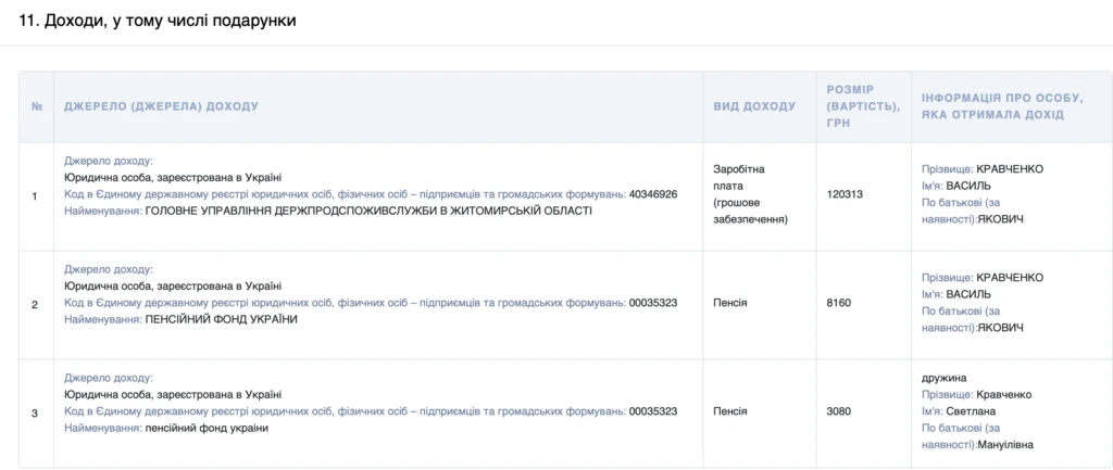 5 лютого Кравченко оприлюднив декларацію при звільненні, яку проаналізували журналісти сайту Житомир-Онлайн. Згідно з документом, у період з 1 по 27 січня 2026 року він отримав 120 тис. 313 грн заробітної плати та 8 160 грн пенсії. За весь 2025 рік його зарплата на посаді керівника міського управління становила 361 тис. 571 грн, пенсія — 104 тис. 995 грн.