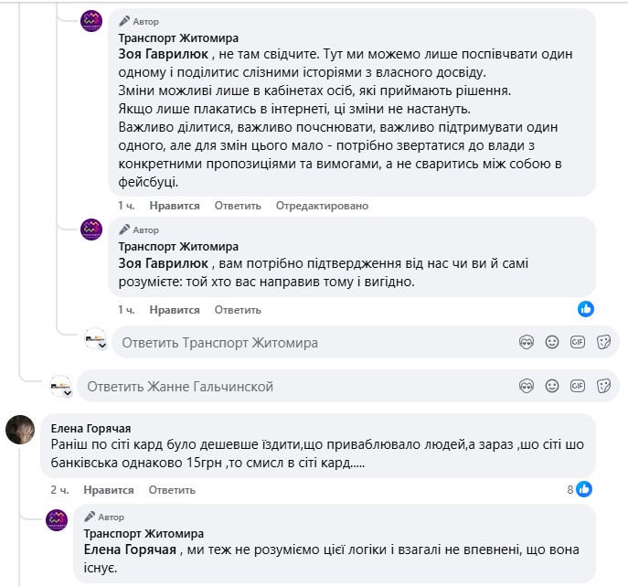 Звертайтеся до Управління транспорту та зв’язку Житомирської міської ради за електронною адресою [email protected]