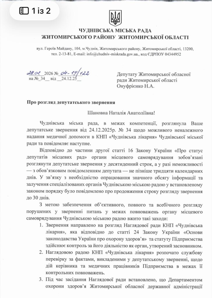 28 січня 2026 року Онуфрієнко отримала відповідь від Чуднівської міської ради на своє депутатське звернення щодо можливих порушень у КНП «Чуднівська лікарня».