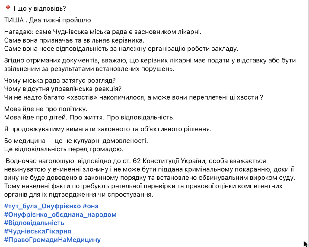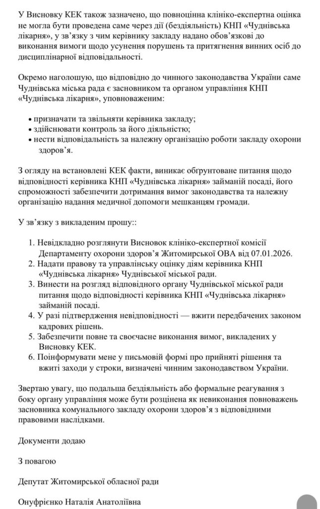29 січня 2026 року депутатка направила висновок комісії разом зі своїм новим депутатським зверненням до Чуднівської міської ради. У зверненні вона вимагає невідкладного розгляду питання відповідальності керівника КНП «Чуднівська лікарня».