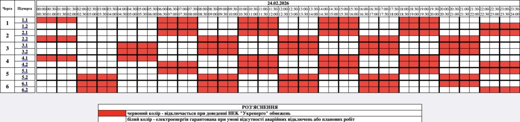 У вівторок, 24 лютого, на території всієї Житомирщини застосовуватимуть цілодобові заходи обмеження споживання електроенергії. Відключення для населення та місцевого бізнесу триватимуть повні 24 години — з 00:00 до 24:00.