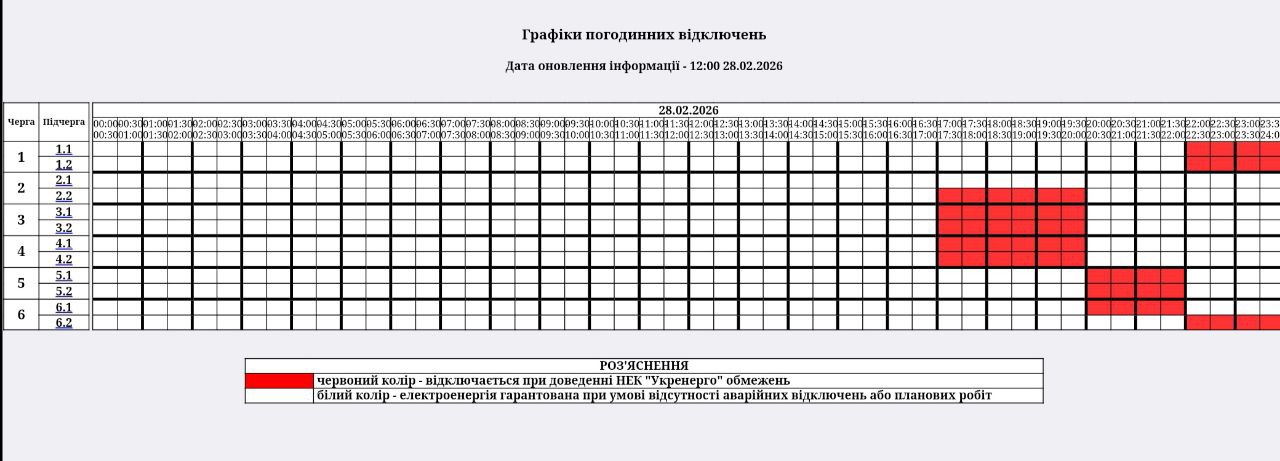 Для населення на цей день заплановано погодинні відключення електроенергії. Світло можуть вимикати та вмикати за чергами з початку і до кінця доби — з 00:00 до 24:00.