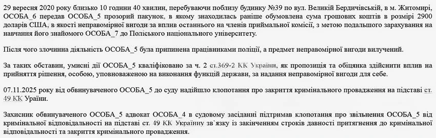 Його дії кваліфікували за частиною 2 статті 369-2 Кримінального кодексу України (зловживання впливом). Однак крапку в цій історії Корольовський районний суд Житомира поставив лише 2 грудня 2025 року. Суддя ухвалив рішення закрити кримінальне провадження та звільнити обвинуваченого від відповідальності у зв’язку із закінченням строків давності.