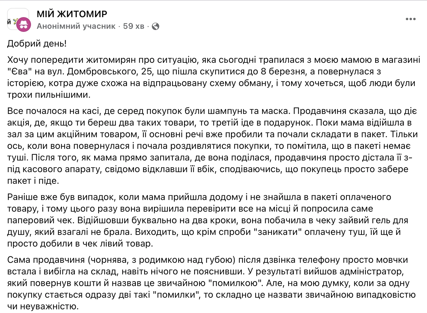 Коли покупець повернулася з претензією, продавчиня, за словами авторки, отримавши телефонний дзвінок, мовчки вибігла на склад без пояснень. Згодом до зали вийшов адміністратор.