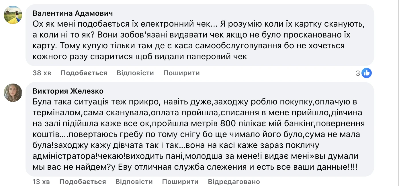 Втім, навіть термінали не гарантують відсутності проблем. Містянка Вікторія Железко поділилася історією, як після успішної оплати на такій касі та підтвердження від консультанта, гроші раптом повернулися їй на картку, коли вона вже відійшла від магазину. Повернувшись назад, аби розібратися, жінка, за її словами, зіткнулася з агресивною поведінкою адміністрації. Замість вибачень за технічний збій, адміністраторка нібито заявила: «Ви думали, ми вас не знайдемо? У “Єви” чудова служба стеження і є всі ваші дані!».