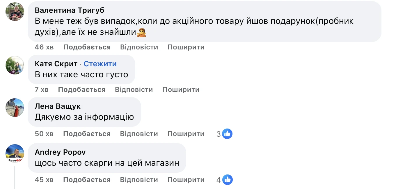 Користувачка Валентина Тригуб розповіла про свій досвід з акціями: «В мене теж був випадок, коли до акційного товару йшов подарунок (пробник духів), але їх не знайшли».