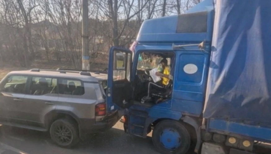 Як видно з місця події, велика синя вантажівка не встигла загальмувати та впритул в’їхала у задню частину сірого позашляховика. Удар призвів до пошкодження транспортних засобів та часткового блокування смуги руху.