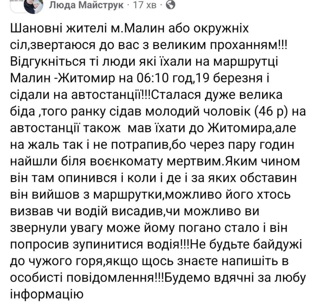«Відгукніться ті люди, які їхали на маршрутці Малин – Житомир на 06:10 год 19 березня і сідали на автостанції!!! Сталася дуже велика біда, того ранку сідав молодий чоловік (46 р) на автостанції, також мав їхати до Житомира, але на жаль так і не потрапив, бо через пару годин знайшли біля військкомату мертвим. Яким чином він там опинився і коли, і де, і за яких обставин він вийшов з маршрутки. Можливо, його хтось визвав, чи водій висадив, чи можливо ви звернули увагу, може йому погано стало і він попросив зупинити водія!!! Не будьте байдужі до чужого горя, якщо щось знаєте, напишіть в особисті повідомлення!!! Будемо вдячні за будь-яку інформацію».