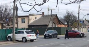 У Житомирі на перехресті вулиць Східної та Бориса Тена сталася аварія: білий позашляховик після зіткнення з червоним легковиком вилетів у зелений паркан