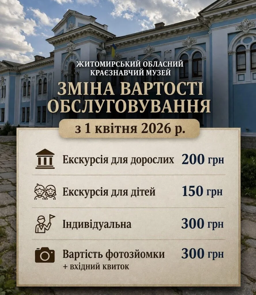 Представники музею розповіли журналістам сайту Житомир-Онлайн щодо зміни вартості послуг, яка набуває чинності з 1 квітня 2026 року. Як з’ясувалося, підвищений тариф стосується виключно професійної фотозйомки, яка створює певні незручності для звичайної роботи закладу.