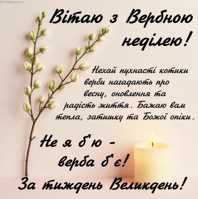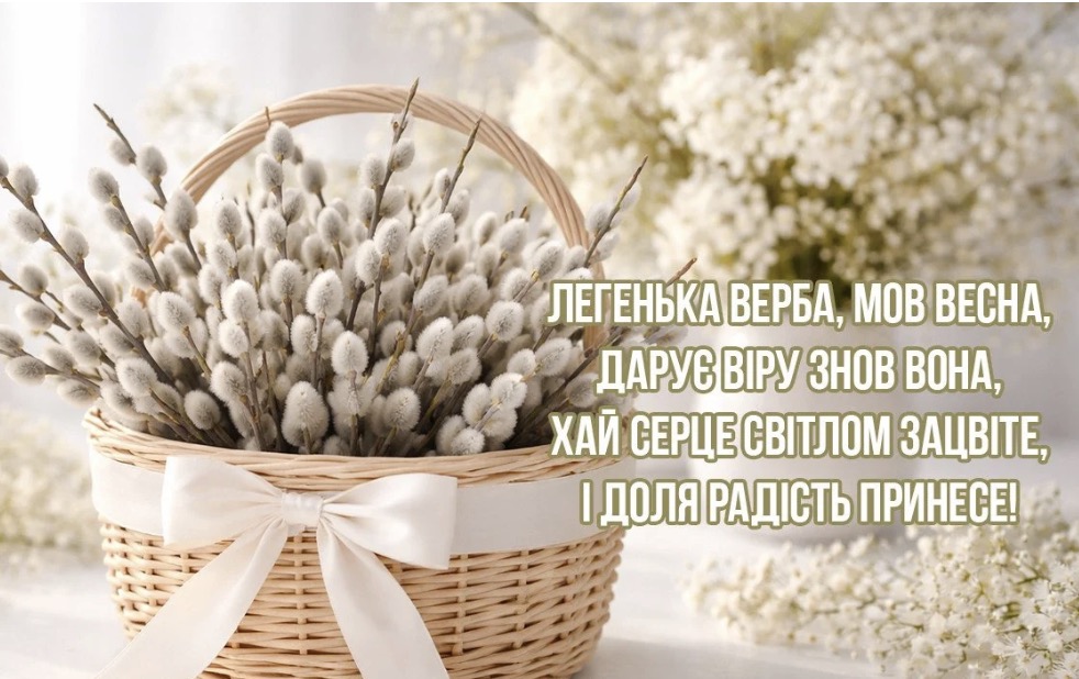 • Вітаю зі святом! Нехай освячена верба стане надійним оберегом для вашої родини. Бажаю світлих думок, щирих усмішок та душевного тепла. Нехай весна розквітає не лише на вулицях, а й у ваших серцях!