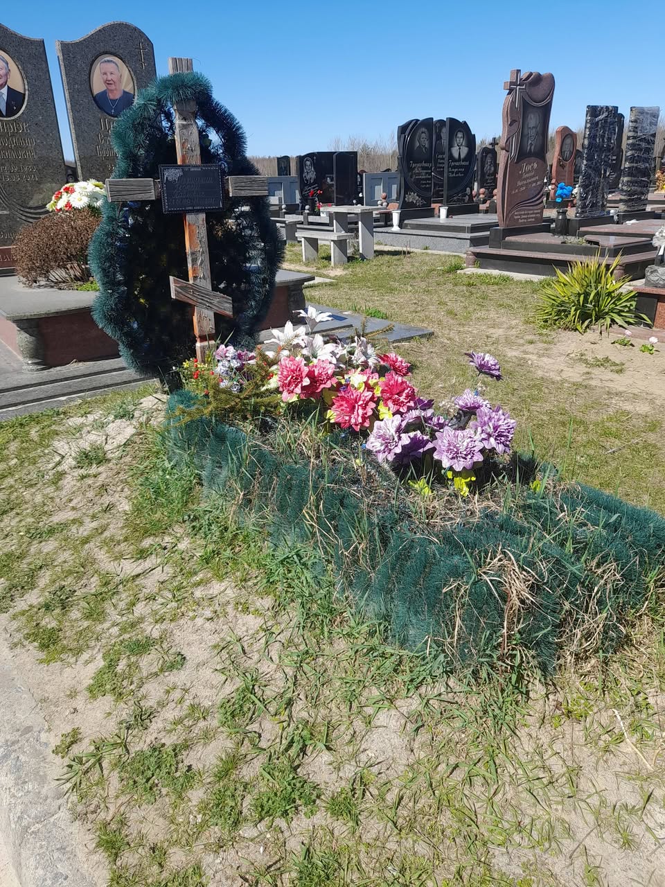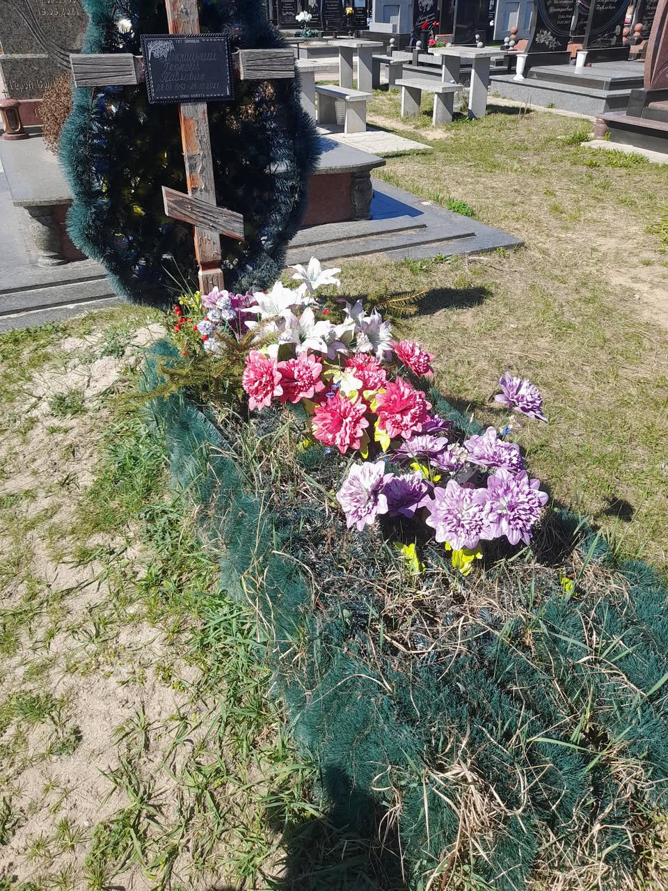 Світлинами з цвинтаря поділилася у Facebook житомирянка Надія Троусковетска. На фото видно разючий контраст: серед масивних гранітних монументів стоїть потемнілий дерев’яний хрест, а сам могильний горбок заріс травою, поверх якої лежать кілька вицвілих штучних квітів.
