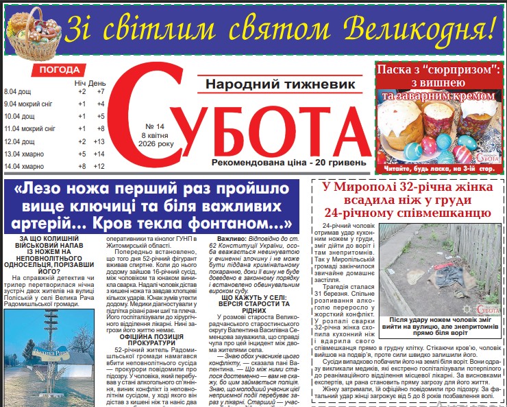 Центральною темою номера стала трагедія у селі Велика Рача Радомишльської громади. Нічна зустріч односельців перетворилася на криваву різанину. Кров била фонтаном, а лезо ножа пройшло в лічених міліметрах від артерії — журналісти відновили хронологію подій, що шокували регіон.