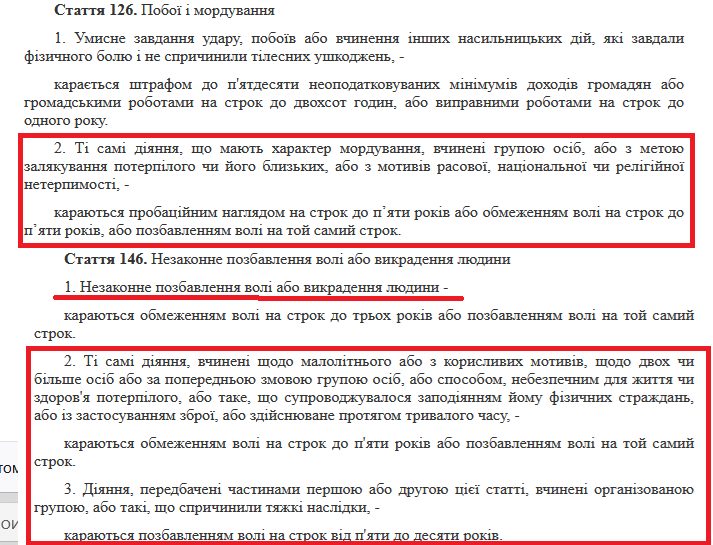 Окремо виділена стаття 126 про побої та мордування. Дії, що мають характер мордування, вчинені групою осіб або з метою залякування, караються тюремним строком до 5 років.