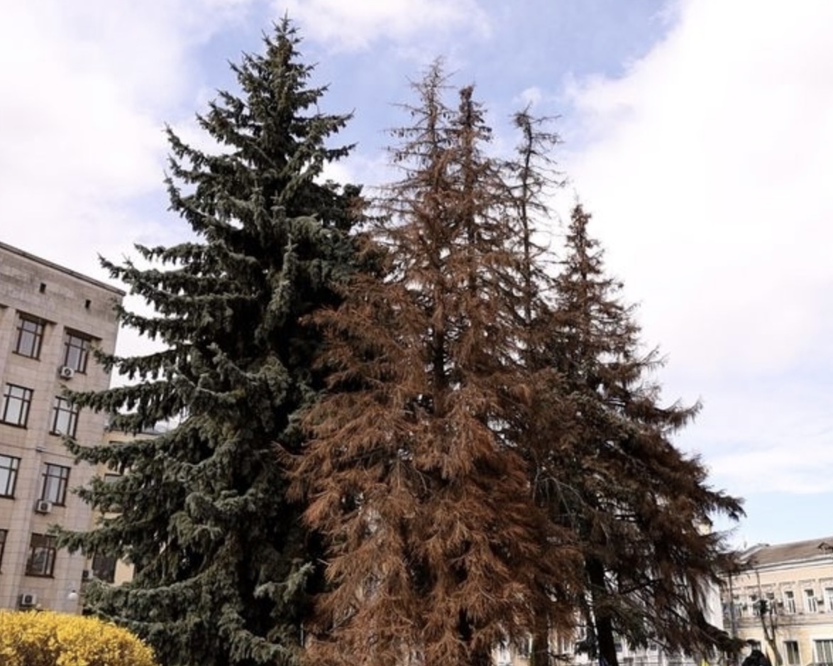 Втім, повністю лисим майдан не залишиться. Окрім засохлих стовбурів, екологи обстежили й інші насадження. Як запевняє Поліна Мурашевська, ще два дерева перебувають у задовільному стані — вони зелені, гарні та залишаються рости на своєму звичному місці.