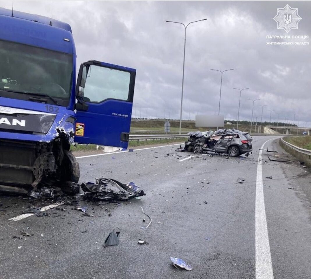 За офіційною інформацією Патрульної поліції Житомирської області, аварія трапилася на 128-му кілометрі автодороги. Судячи з оприлюднених фотографій з місця події, зіткнення було надзвичайно потужним: на дорозі стоїть розбита синя вантажівка MAN, а неподалік від неї — вщент розтрощений легковий автомобіль, який перетворився на купу металу. Уламки транспортних засобів розкидані по всій проїжджій частині.