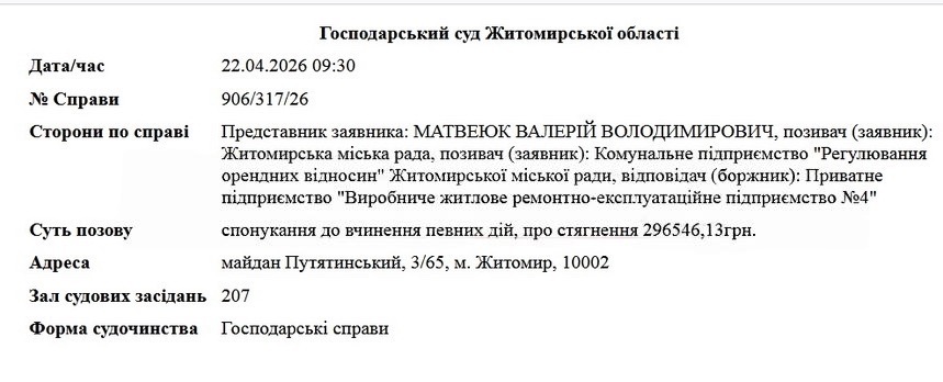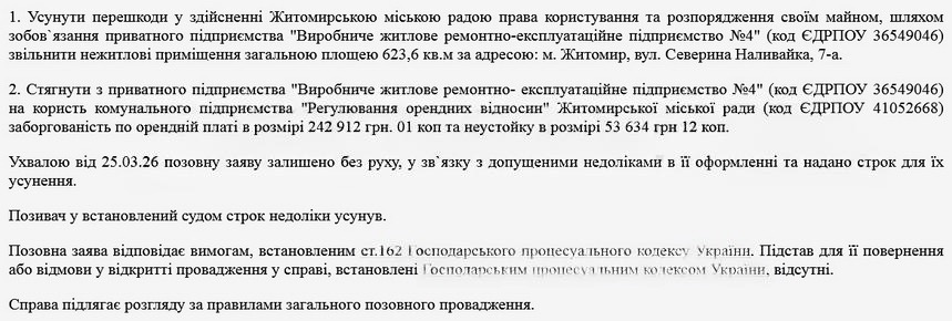 У березні 2026 року комунальне підприємство «Регулювання орендних відносин» звернулося до суду. Позивач вимагає від приватного «Виробничого житлового ремонтно-експлуатаційного підприємства №4» негайно звільнити комунальні метри та повернути місту гроші за оренду. Господарський суд Житомирської області вже відкрив провадження за обома позовами міськради.