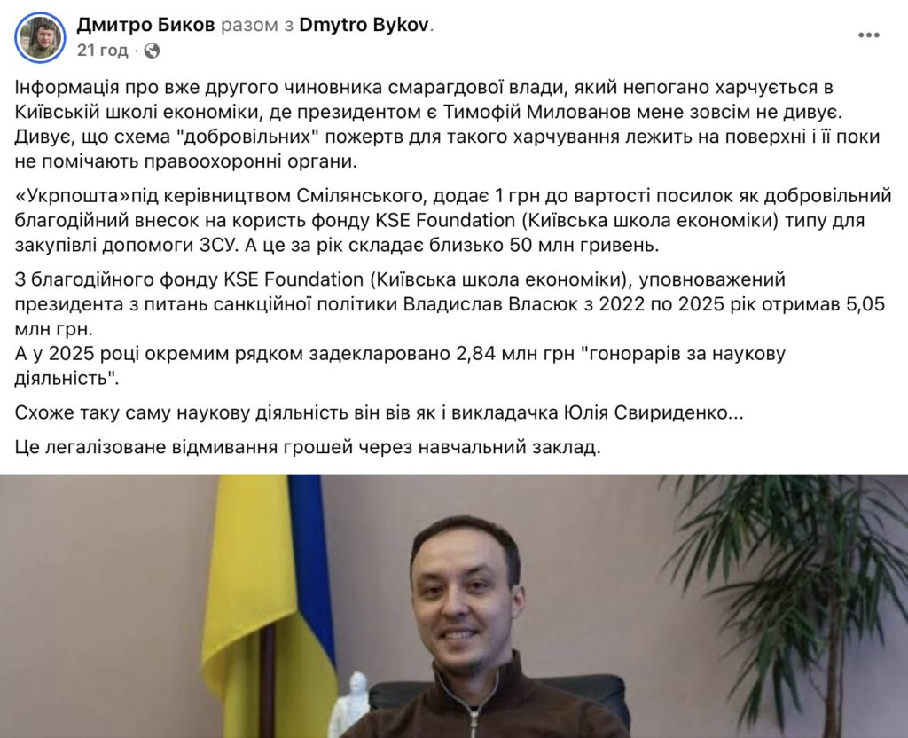 «Інформація про вже другого чиновника смарагдової влади, який непогано харчується в Київській школі економіки, де президентом є Тимофій Милованов, мене зовсім не дивує. Дивує, що схема “добровільних” пожертв для такого харчування лежить на поверхні і її поки не помічають правоохоронні органи. “Укрпошта” під керівництвом Смілянського додає 1 грн до вартості посилок як добровільний благодійний внесок на користь фонду KSE Foundation нібито для закупівлі допомоги ЗСУ. А це за рік складає близько 50 млн гривень», — зазначає Биков.