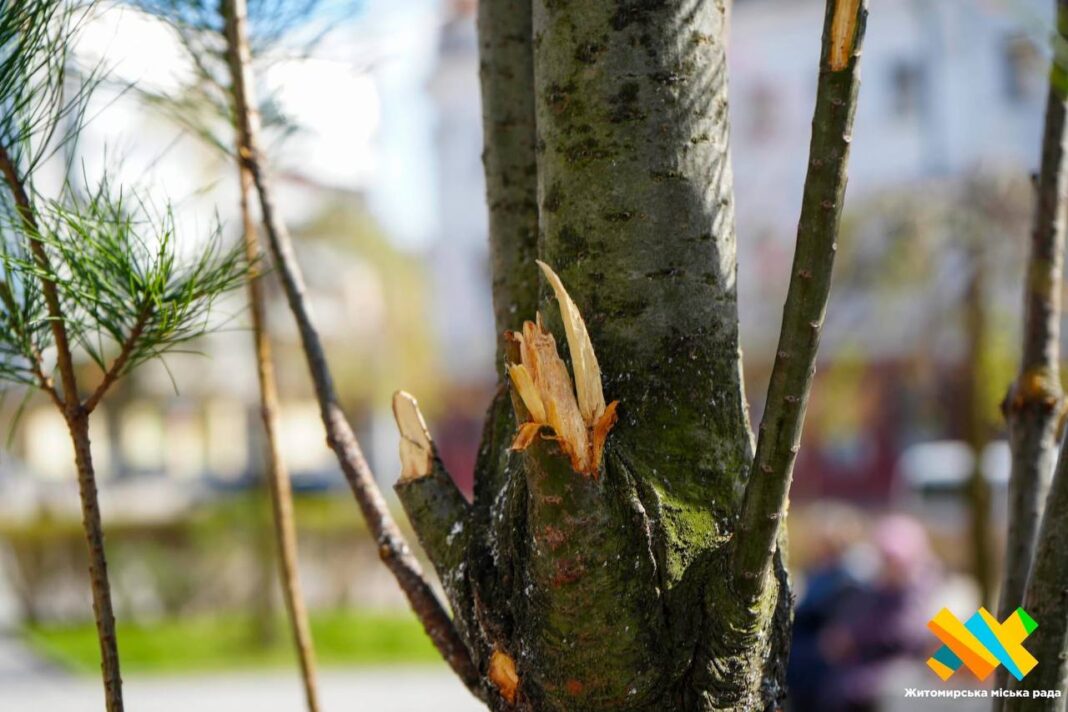 У сквері, що розташований на розі вулиць Великої Бердичівської та Театральної у Житомирі, невідомі особи влаштували акт безглуздого вандалізму. Ціллю зловмисників стали молоді сосни — дерева залишили з поламаними гілками та знівеченими стовбурами, з яких тепер ллється живиця.