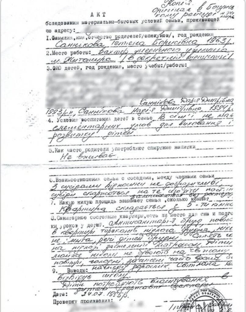 У 1995 році дітей відібрали в матері. Наді тоді був рік. Старших дітей передали до інтернату, а менші жили в дитячому будинку. Надія витребувала з дитячого будинку свою особову справу. У ній, серед іншого, вказані причини вилучення дітей: «Антисанітарія, бруд, в квартирі повно тарганів, підлога брудна, ніколи не мита, речі дітей брудні». Також в документі вказано, що діти були голодні, спали на встеленій матрацом підлозі, їх часто зачиняли вдома без нагляду дорослих. Дівчина надала документ редакції.