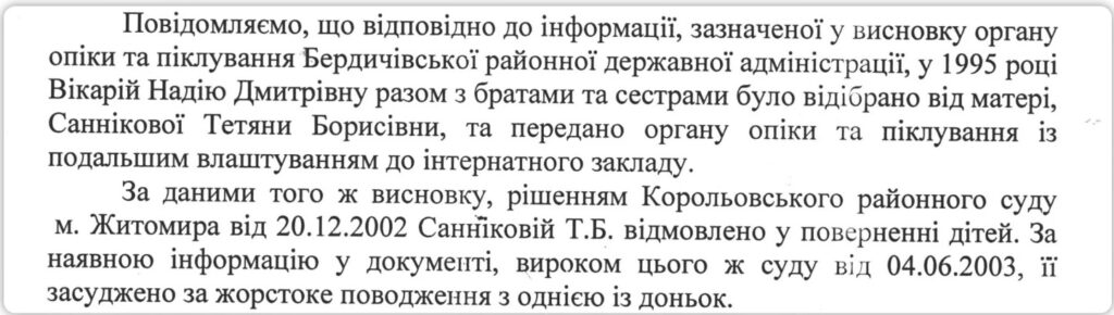 «Бабель» встановив, що у 2002 році матір намагалася забрати дітей через суд — але їй відмовили. А в червні 2003 року Тетяну Саннікову ще й засудили за жорстоке поводження з дитиною (за інформацією «Бабеля», мова йде про Дарію Вікарій). Але матері все одно вдалося забрати дітей до себе.