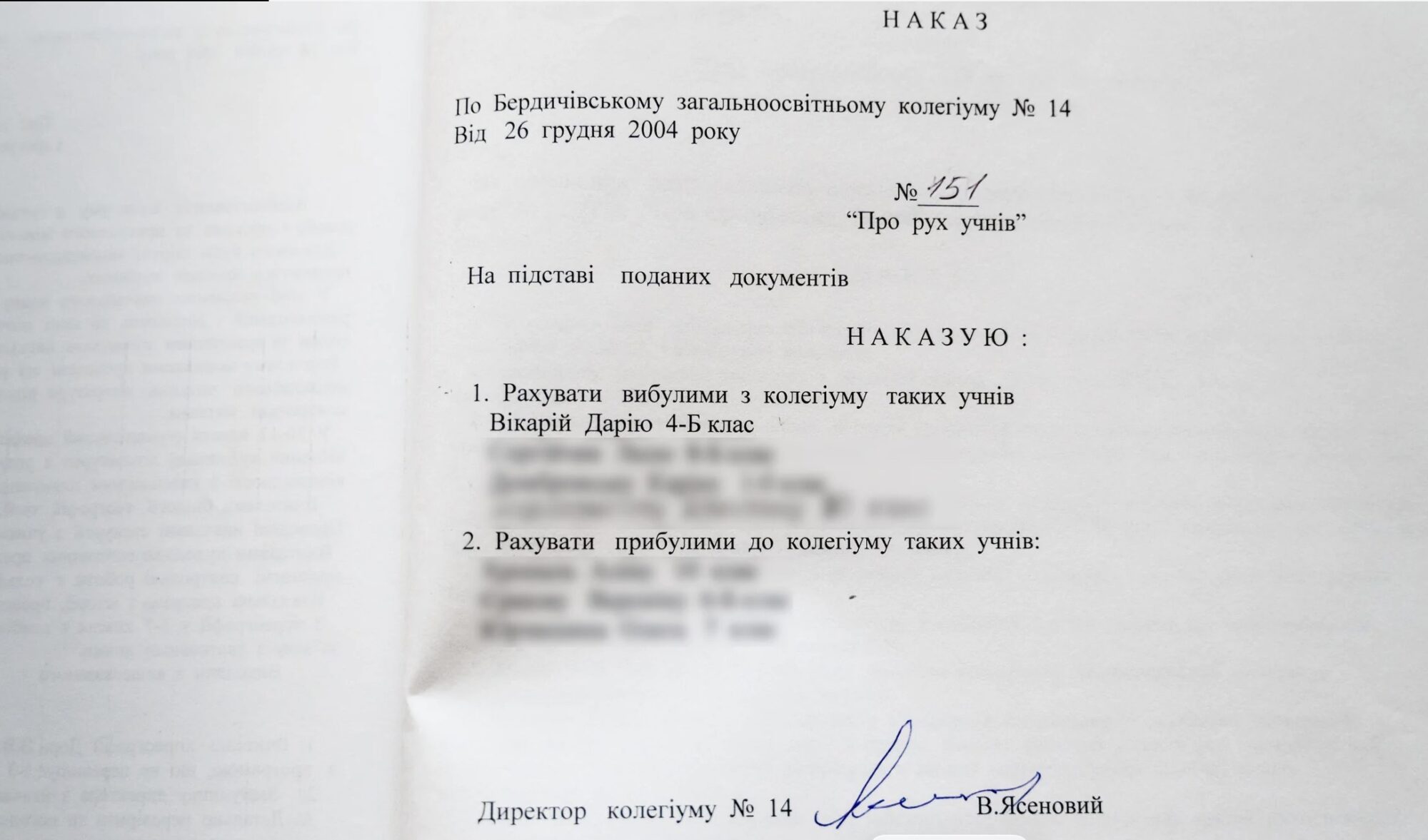 У четвертий клас Надя і Даша перейшли разом, щоправда, Даша — лише на папері. У документах, які «Бабелю» вдалося знайти в колегіумі, вказано: Дашу відрахували 26 грудня 2004 року, а померла вона ще в червні того ж року. Як мертва дитина дві четверті навчалася в колегіумі, нинішній директор Олександр Григорцевич пояснити не може — він прийшов на посаду лише в 2006-му. Завучка, що тоді працювала, померла. Тодішній директор — давно на пенсії, у поганому стані, йому за 80.