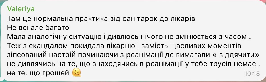 «Мала аналогічну ситуацію і дивлюсь, нічого не змінюється з часом. Теж зі скандалом покидала лікарню і замість щасливих моментів отримала зіпсований настрій, починаючи з реанімації, де вимагали «віддячити». І це не дивлячись на те, що знаходячись у реанімації у тебе трусів немає, не те що грошей», — відверто розповідає жінка.