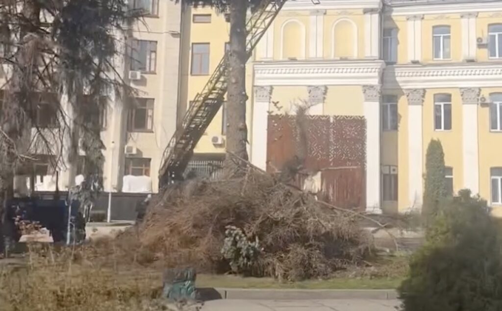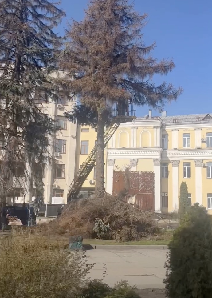 Попри цілком виправданий жаль за втраченим озелененням, варто звернути увагу на одну важливу деталь, яку чітко видно на світлинах із місця подій. Ялинка, яку саме розпилюють робітники, не є зеленою та живою. Її хвоя повністю стала рудою, а гілки виглядають сухими.