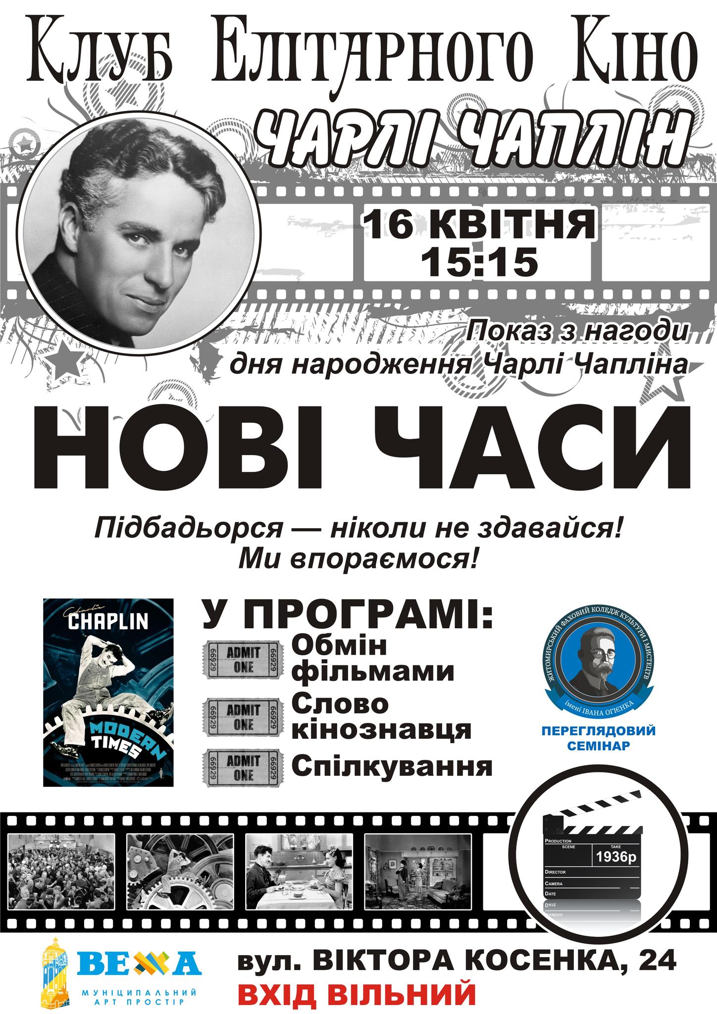 Сьогодні, 16 квітня, світ відзначає день народження великого коміка та режисера Чарлі Чапліна. З цієї нагоди житомирський «Клуб Елітарного Кіно» запрошує мешканців міста на спеціальний показ одного з найвідоміших шедеврів майстра — фільму «Нові часи» (Modern Times).