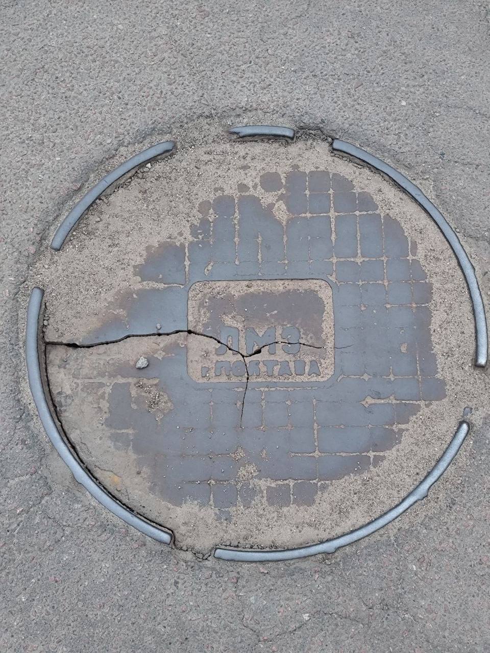 На знімку чітко видно, що важка металева кришка люка має глибоку наскрізну тріщину, яка розколола її майже навпіл. Таке пошкодження означає, що конструкція втратила свою міцність. Якщо на цей люк наступить доросла людина, або наїде колесо автомобіля чи навіть дитячого візочка, кришка може просто обвалитися всередину колодязя, що неминуче призведе до серйозних травм.