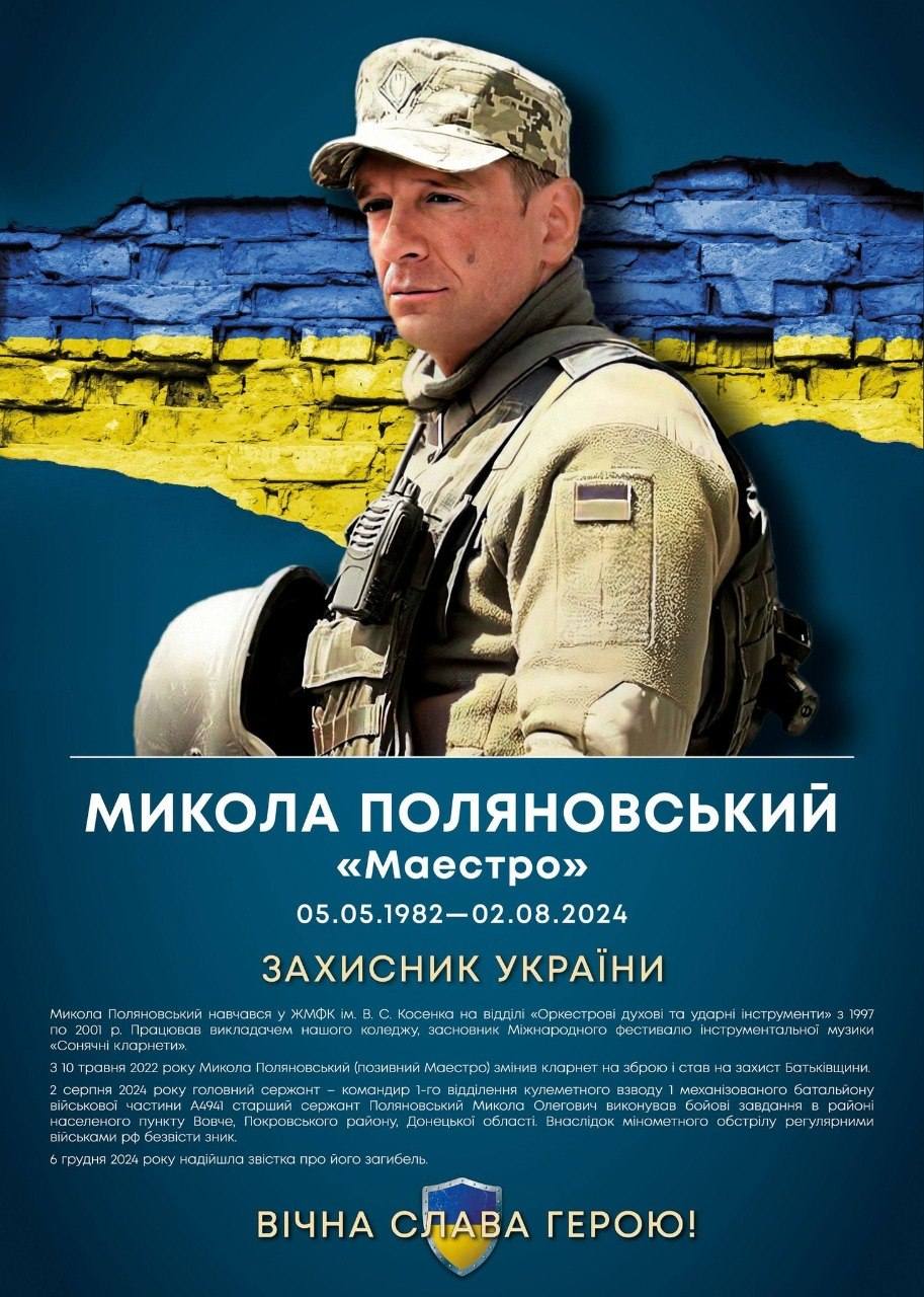 20 квітня 2026 року в Житомир відбудеться прощання з Миколою Поляновським (позивний «Маестро») — військовим, музикантом і викладачем.