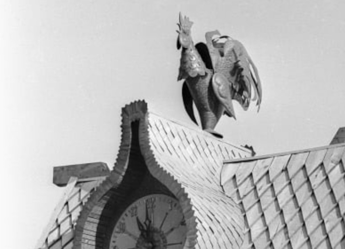Але справжньою візитівкою закладу, яка й дала йому назву, став неймовірний казковий будиночок. На його даху красувався великий механічний годинник, увінчаний фігурою мідного півника.