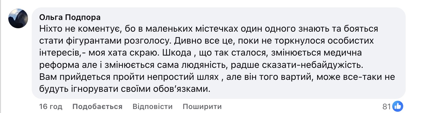 Публікація пані Оксани у місцевій спільноті “БАРАНІВКА/ЗВЯГЕЛЬ БАРАХОЛКА” спрацювала як тригер для багатьох містян. У коментарях люди почали ділитися своїми історіями, звертаючи увагу на системні проблеми з місцевою медициною та пояснюючи, чому більшість боїться відкрито виступати проти лікарів.
