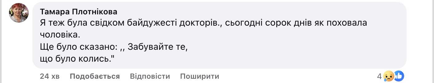 «Я теж була свідком байдужості докторів, сьогодні сорок днів як поховала чоловіка. Ще було сказано: “Забувайте те, що було колись”».