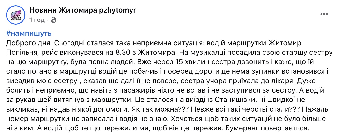 «Вже через 15 хвилин сестра дзвонить і каже, що їй стало погано в маршрутці. Водій це побачив і посеред дороги, де нема зупинки, зупинився і висадив мою сестру. Сказав, що далі її не повезе (сестра учора приїхала до лікаря). Дуже болить і неприємно, що навіть з пасажирів ніхто не встав і не заступився. А водій за рукав ще й витягнув з маршрутки. Це сталося на виїзді із Станишівки: ні швидкої не викликав, ні надав ніякої допомоги», — з розпачем пише авторка звернення.