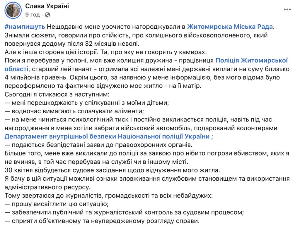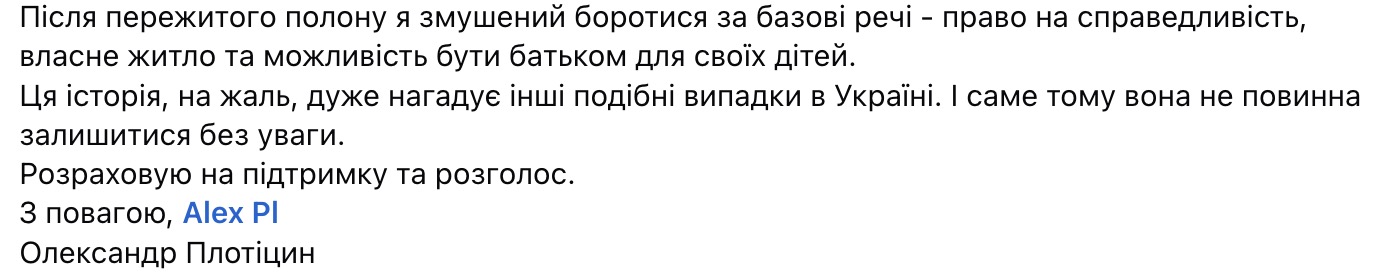 30 квітня відбудеться судове засідання щодо відчуження мого житла. Я бачу в цій ситуації можливі ознаки зловживання службовим становищем та використання адміністративного ресурсу… Після пережитого полону я змушений боротися за базові речі – право на справедливість, власне житло та можливість бути батьком для своїх дітей.”